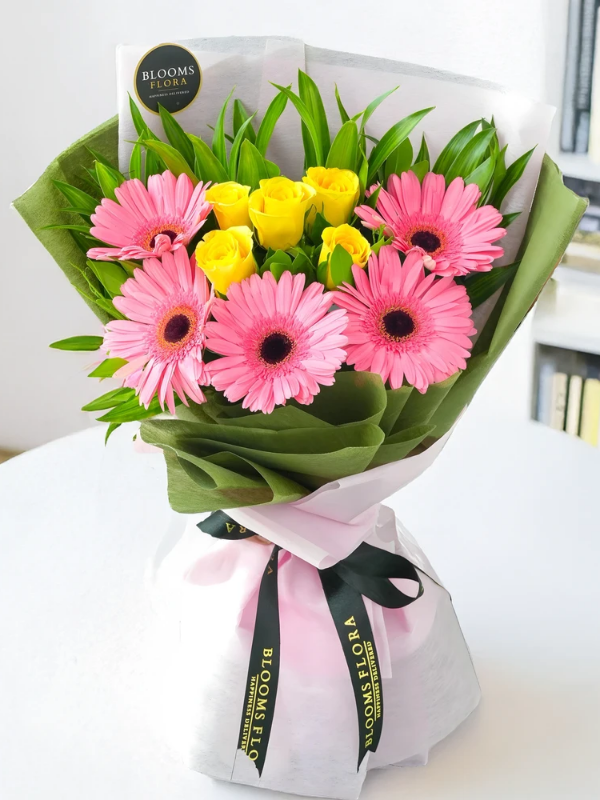 Sarı gül ve pembe jerberalardan oluşan güzel bir buket.